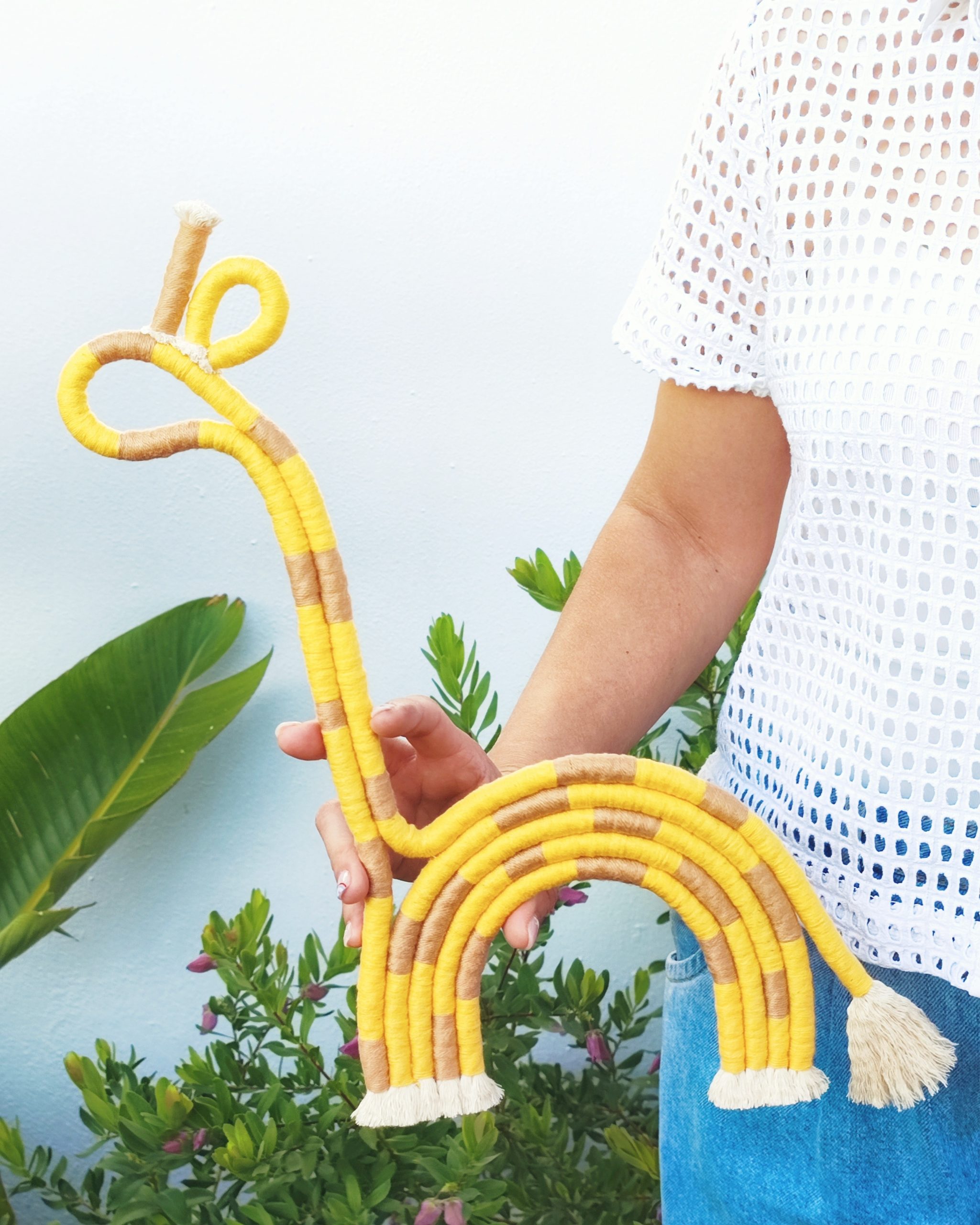 Figura decorativa con anilla en la parte posterior para colgar en pared, con los colores característicos. Cuerda de 6 mm y acabado con flecos en patas, cola y cuerno.