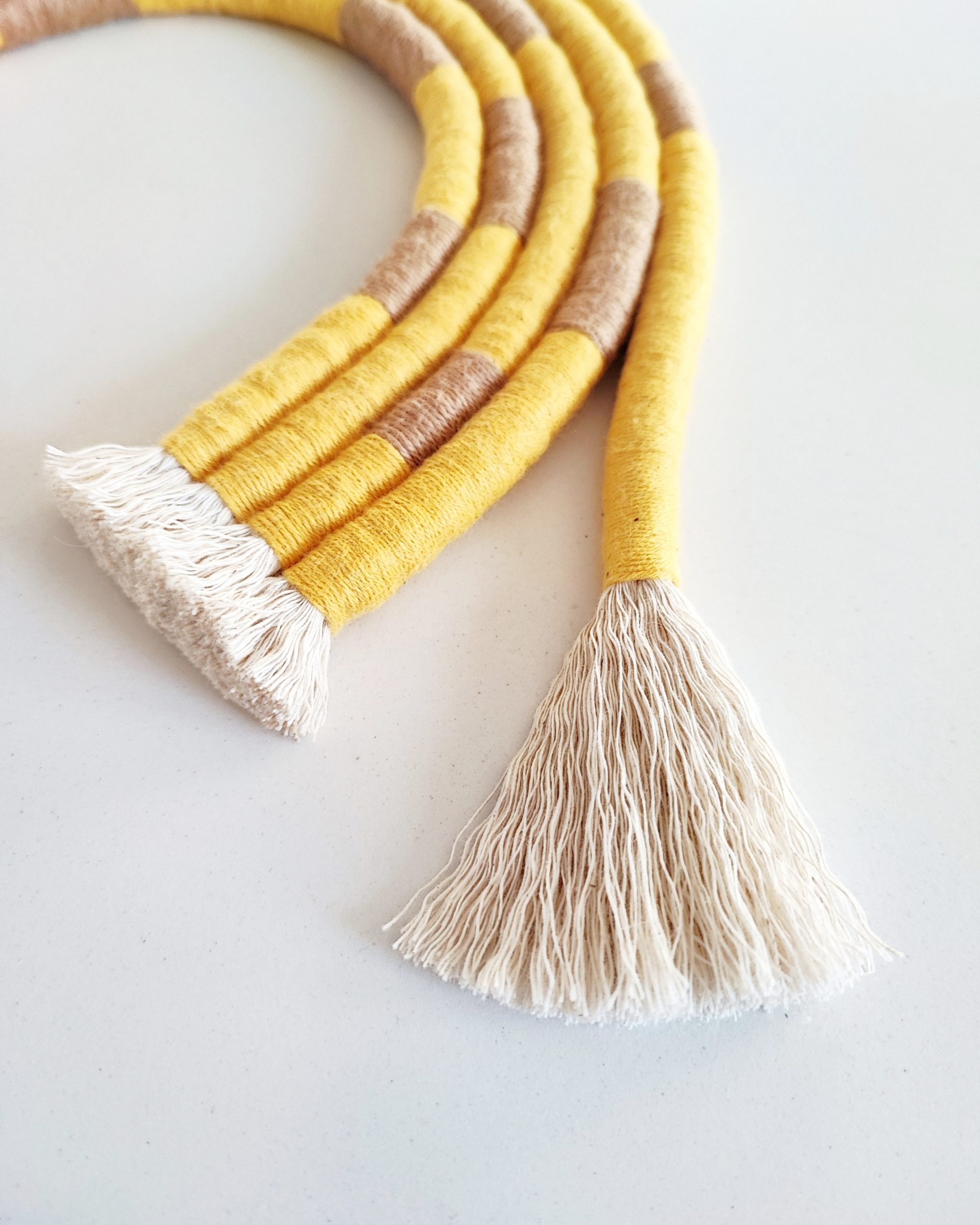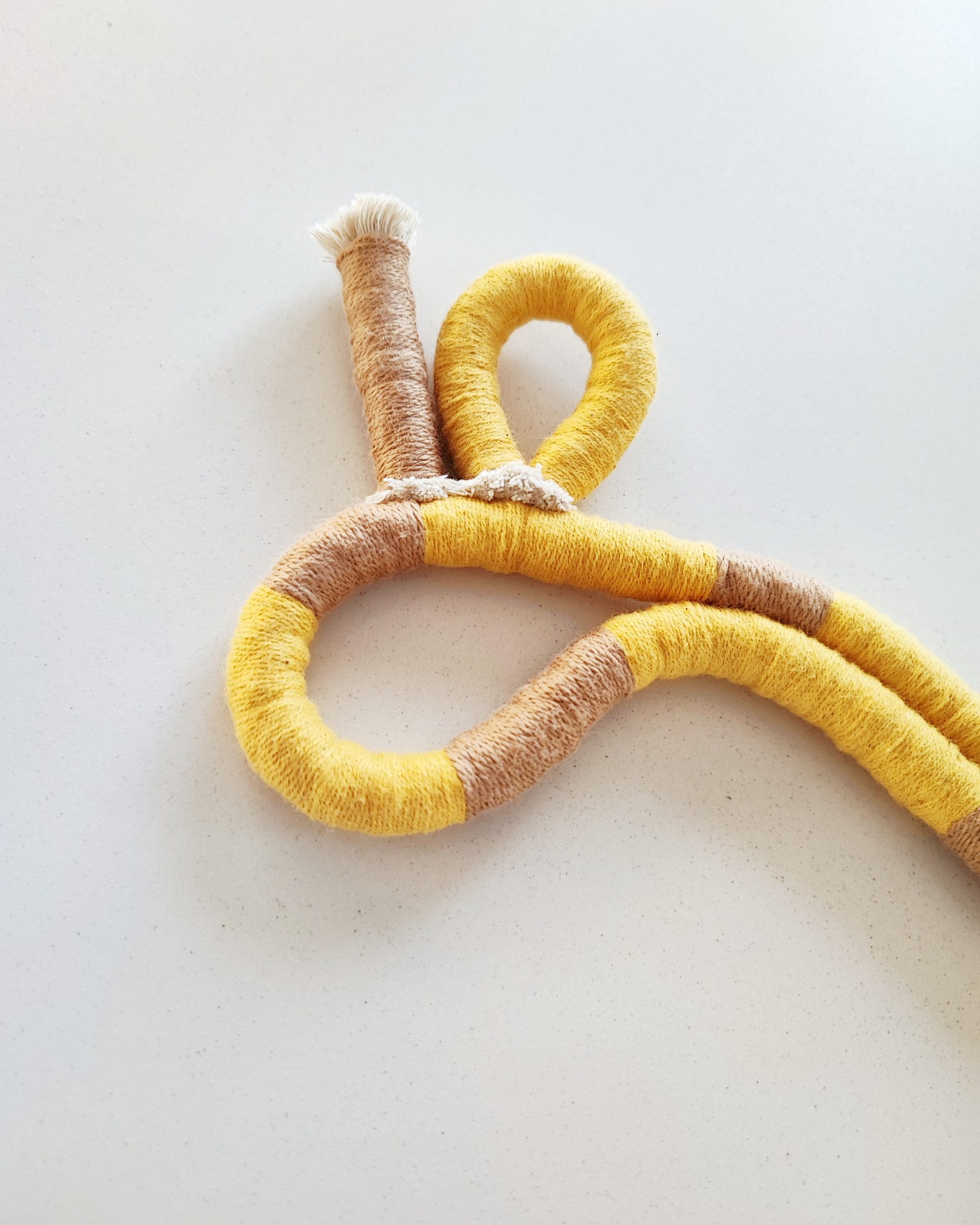 Hilo y cuerda de algodón 100% de 6 mm y 12 mm de grosor. Bolas decorativas de madera. Algunas piezas llevan una anilla de metal para una buena sujeción a la pared. Interior de las letras con alambre para dar la forma y que tengan mayor resistencia.