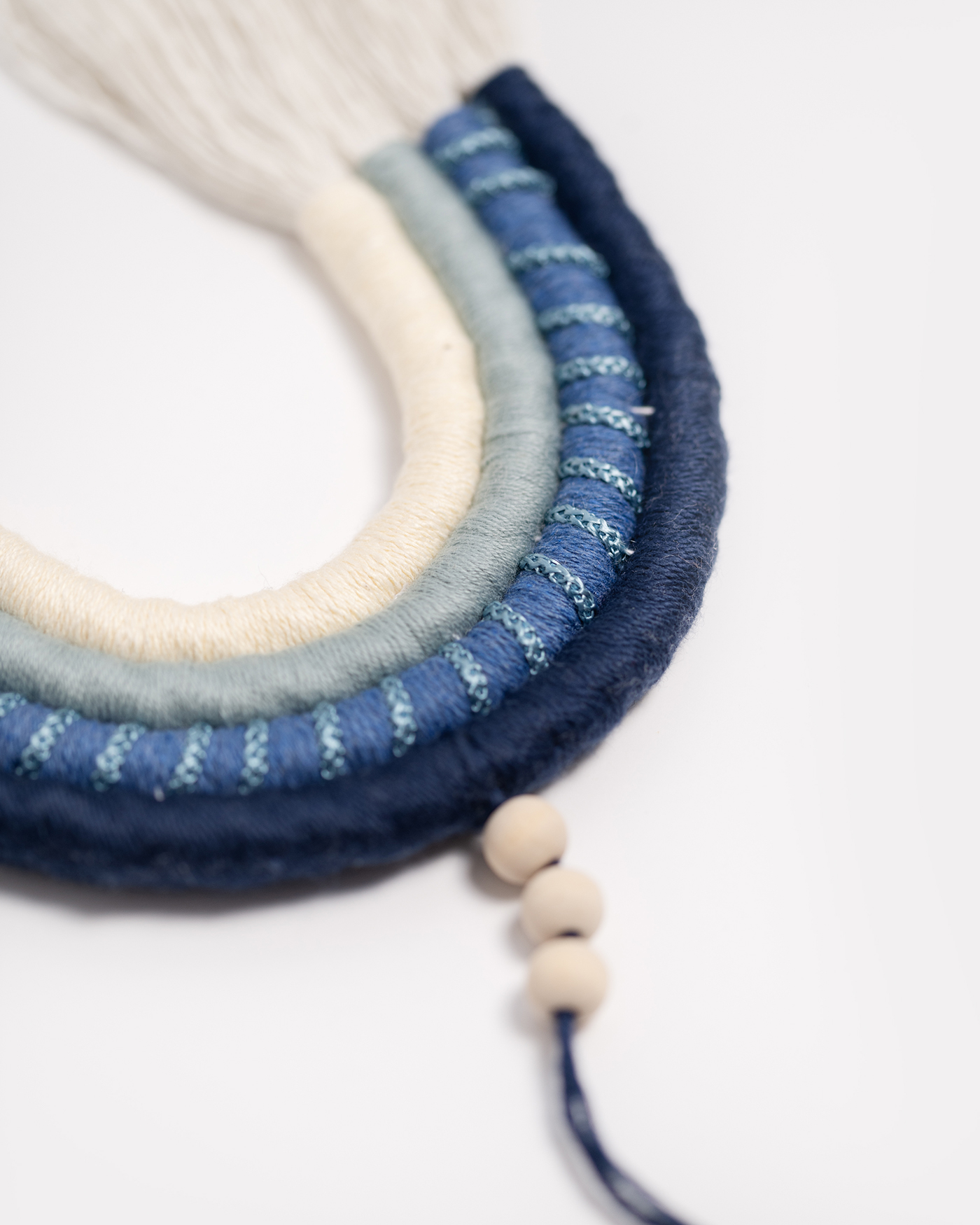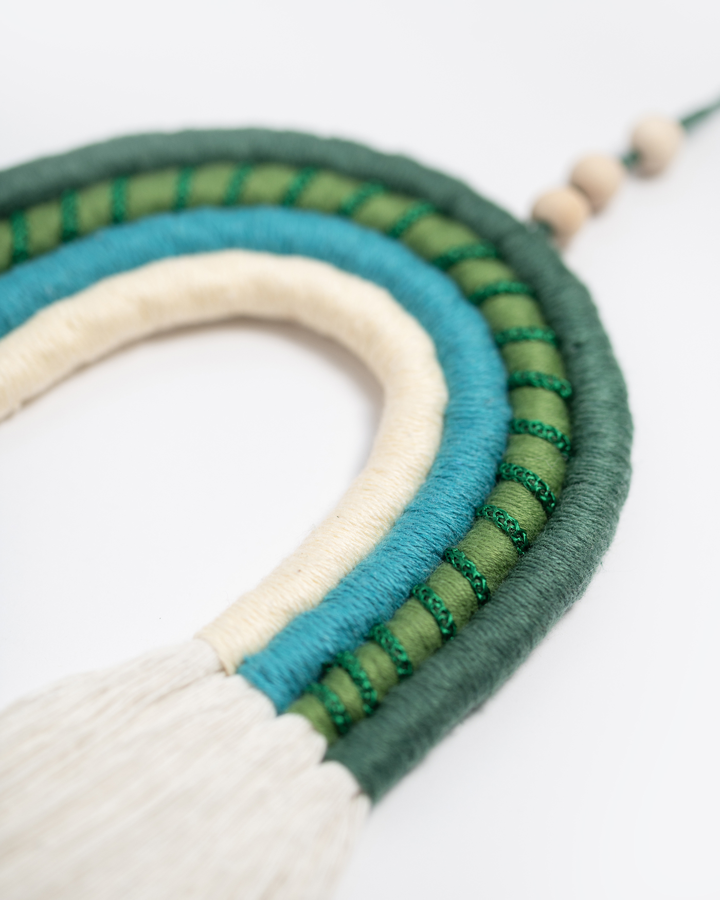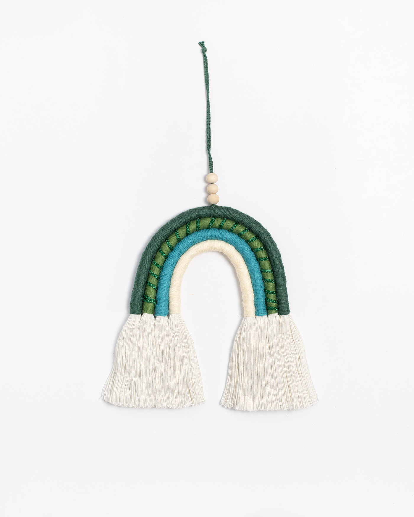 Arcoíris colgante mediante hilo y tres bolas de madera, realizado en 4 colores y cuerda de 6mm. Acabado con flecos largos.
