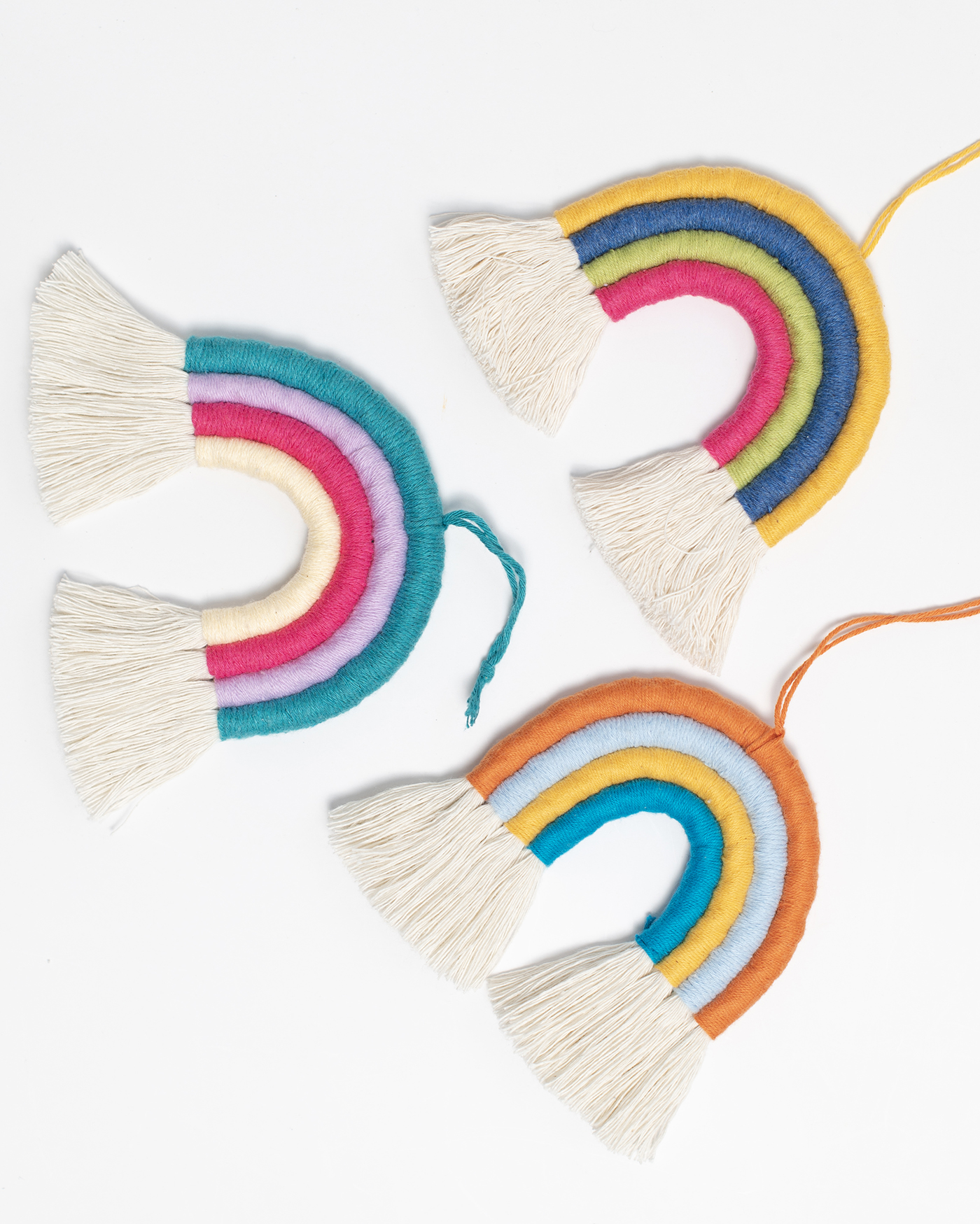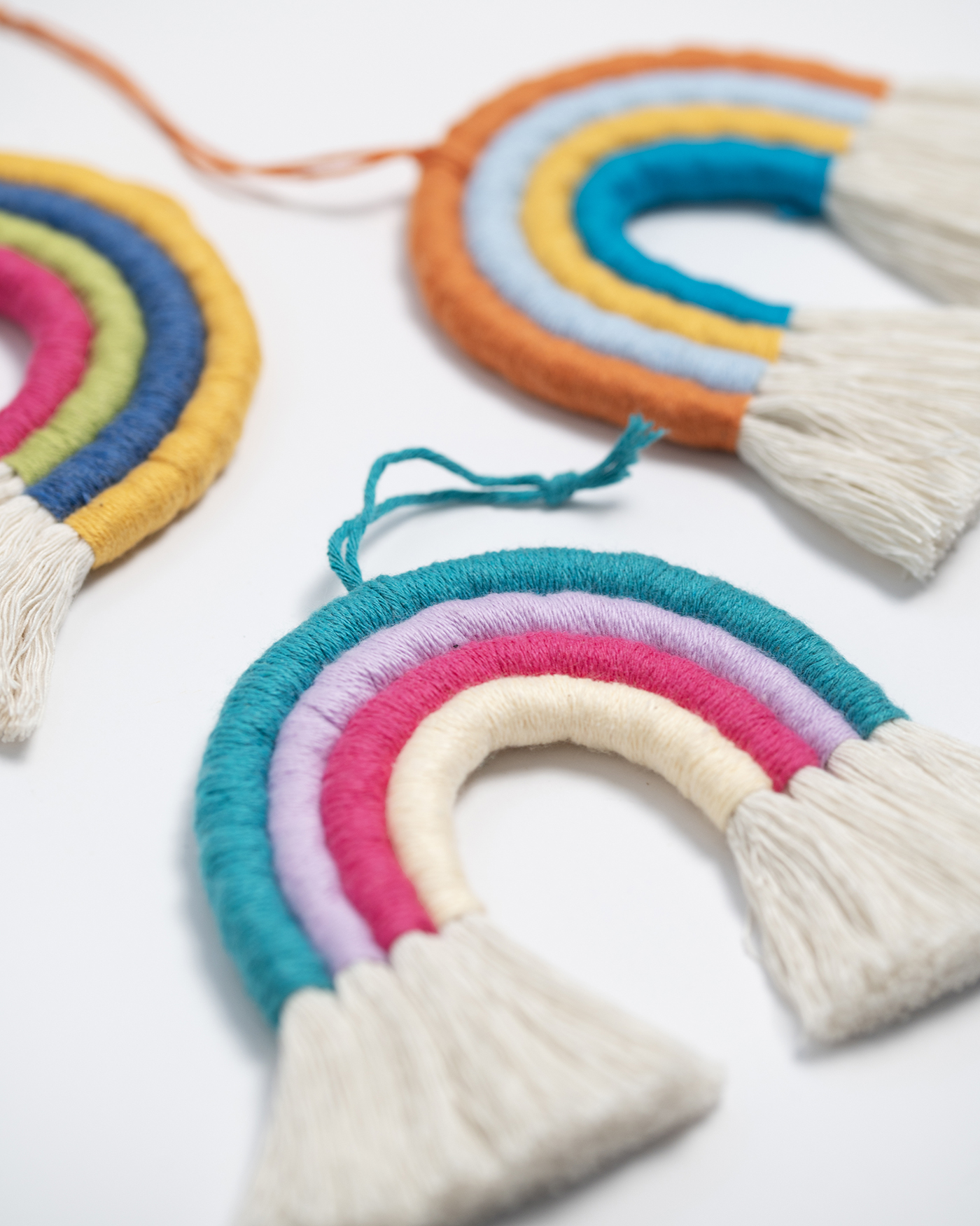 Arcoíris colgante mediante hilo y realizado en 4 colores y cuerda de 6 mm. Acabado con flecos cortos.