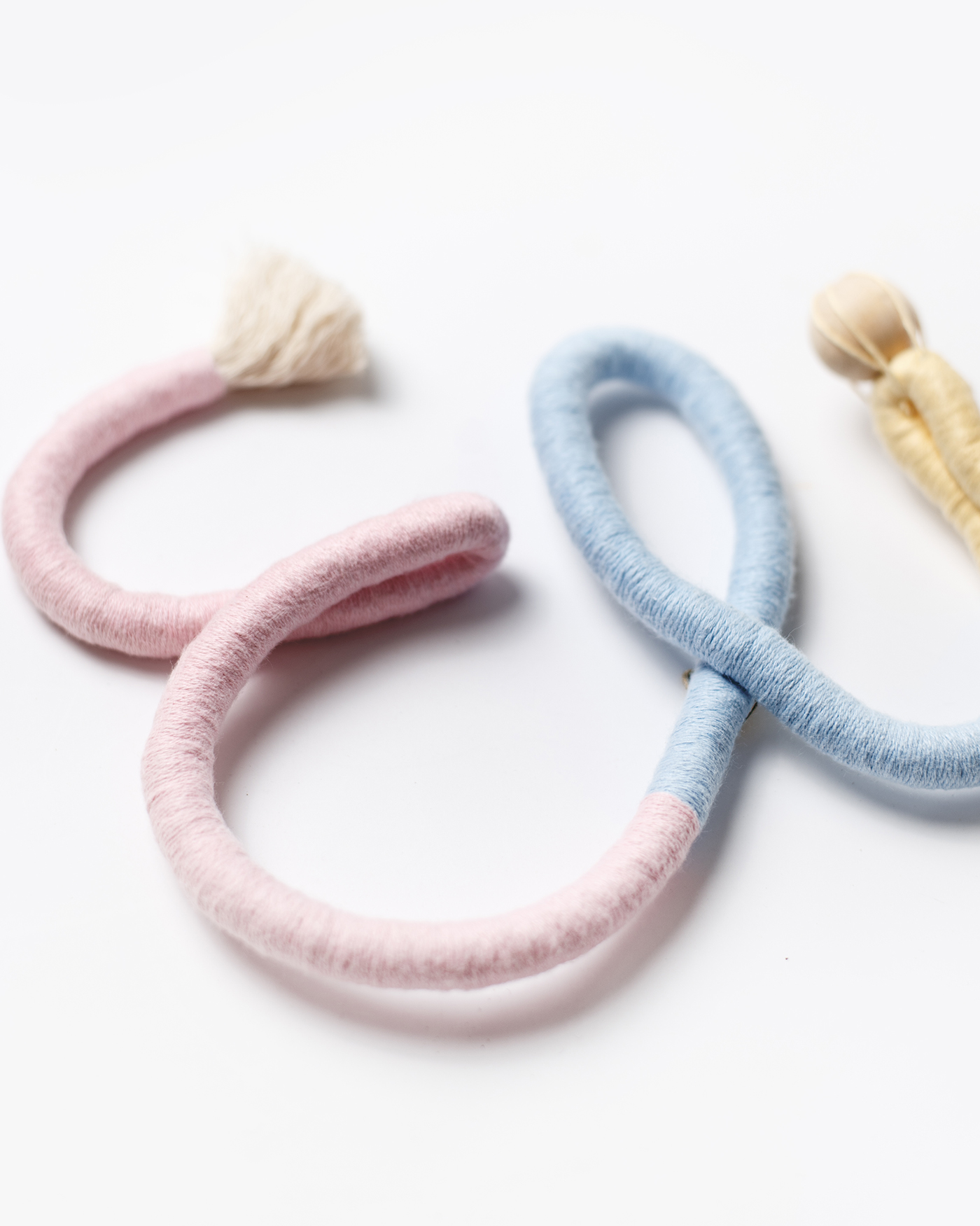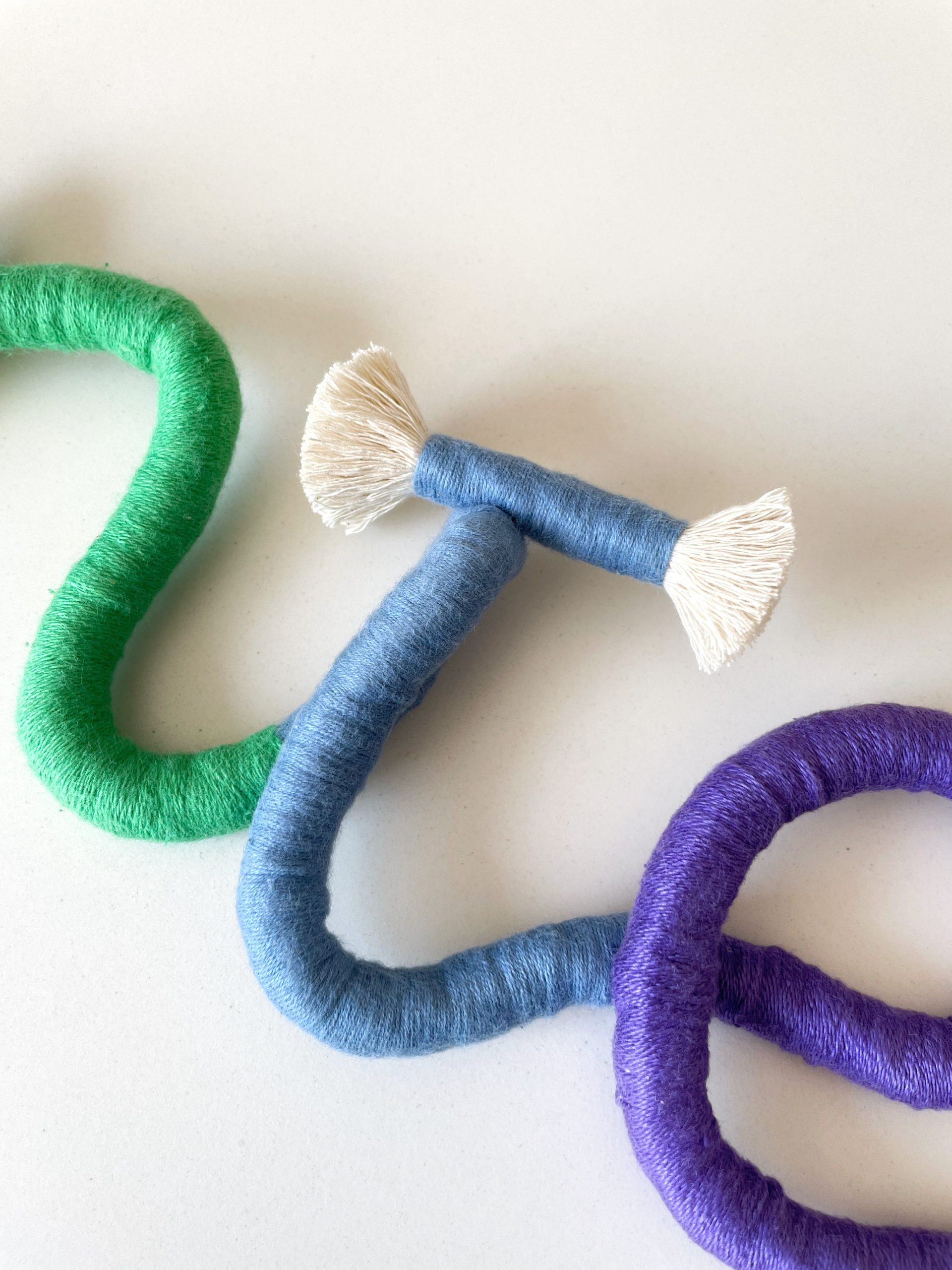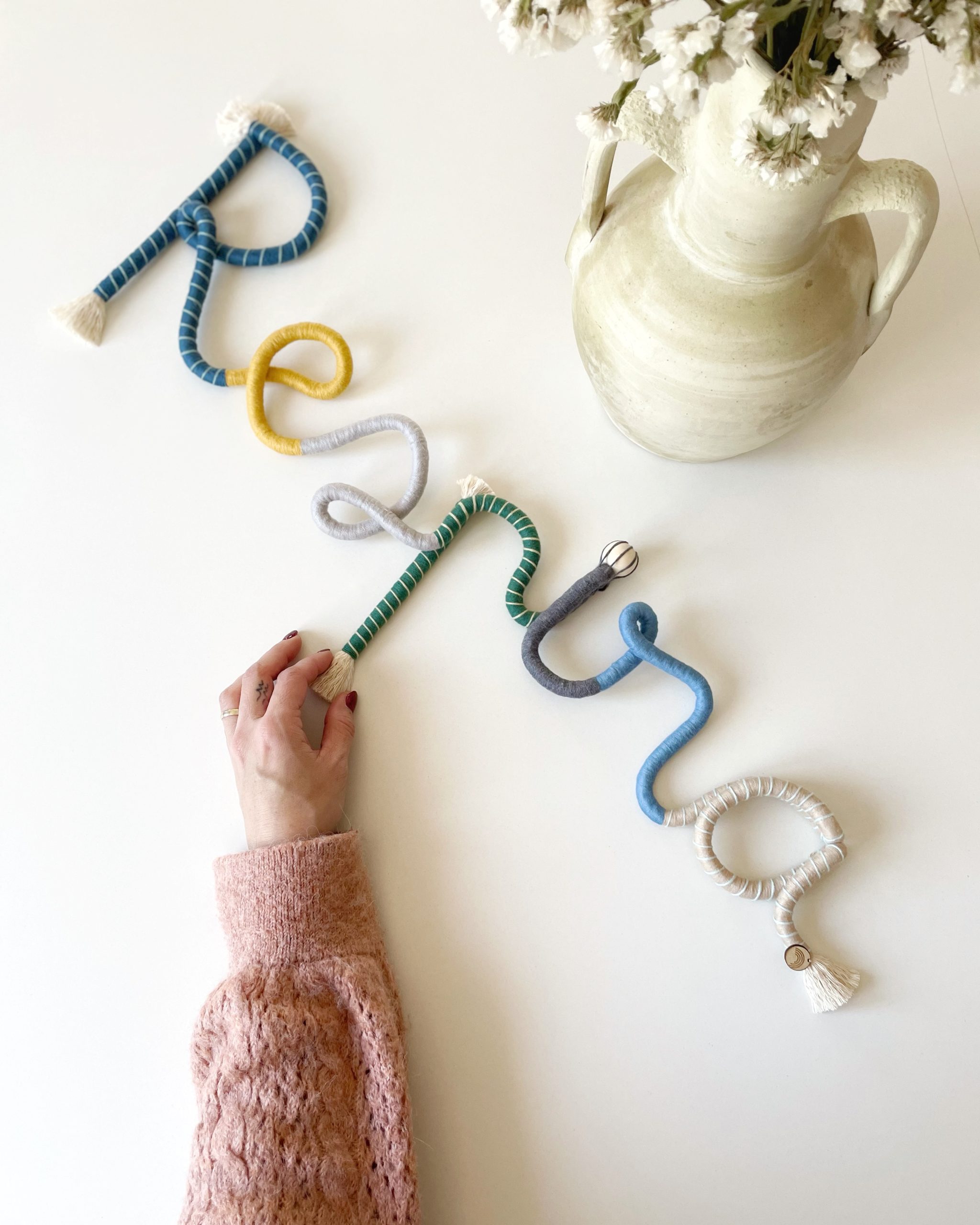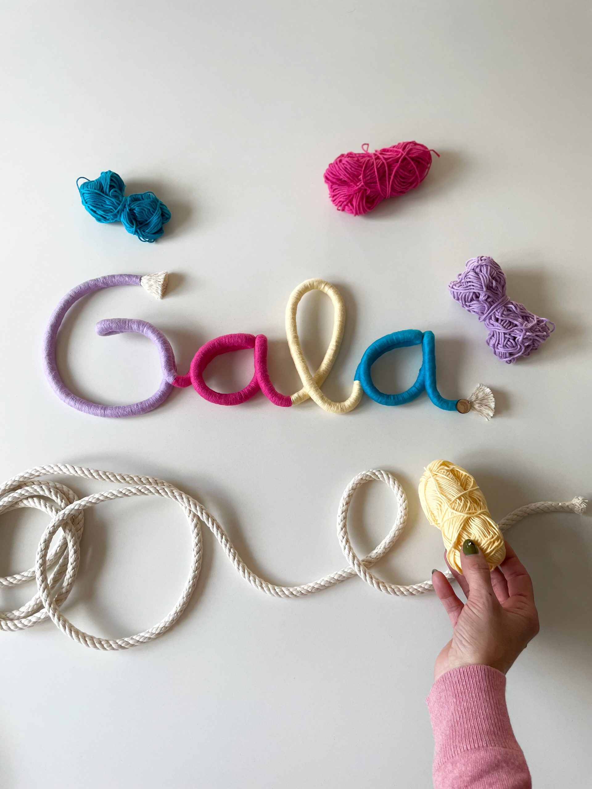 Hilo y cuerda de algodón 100% de 6 mm y 12 mm de grosor. Bolas decorativas de madera. Algunas piezas llevan una anilla de metal para una buena sujeción a la pared. Interior de las letras con alambre para dar la forma y que tengan mayor resistencia.