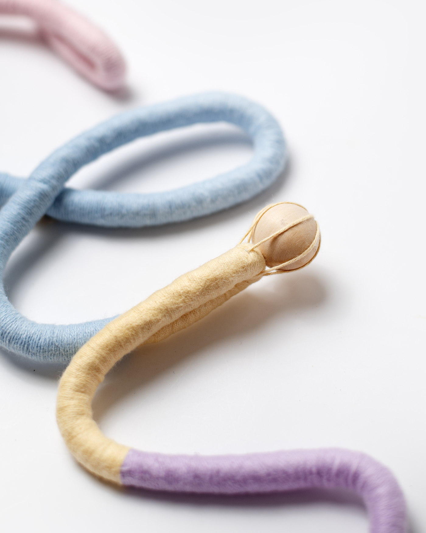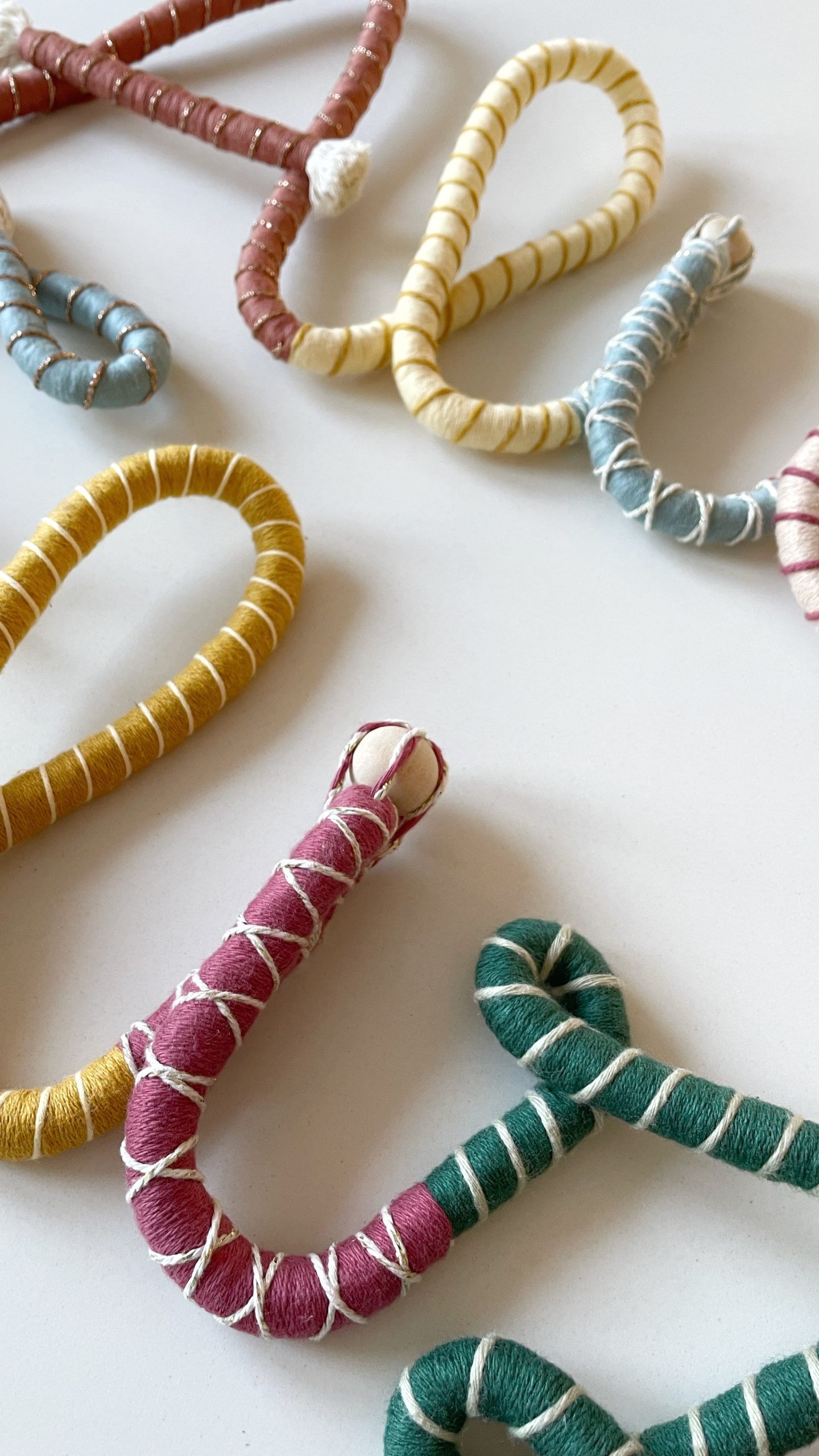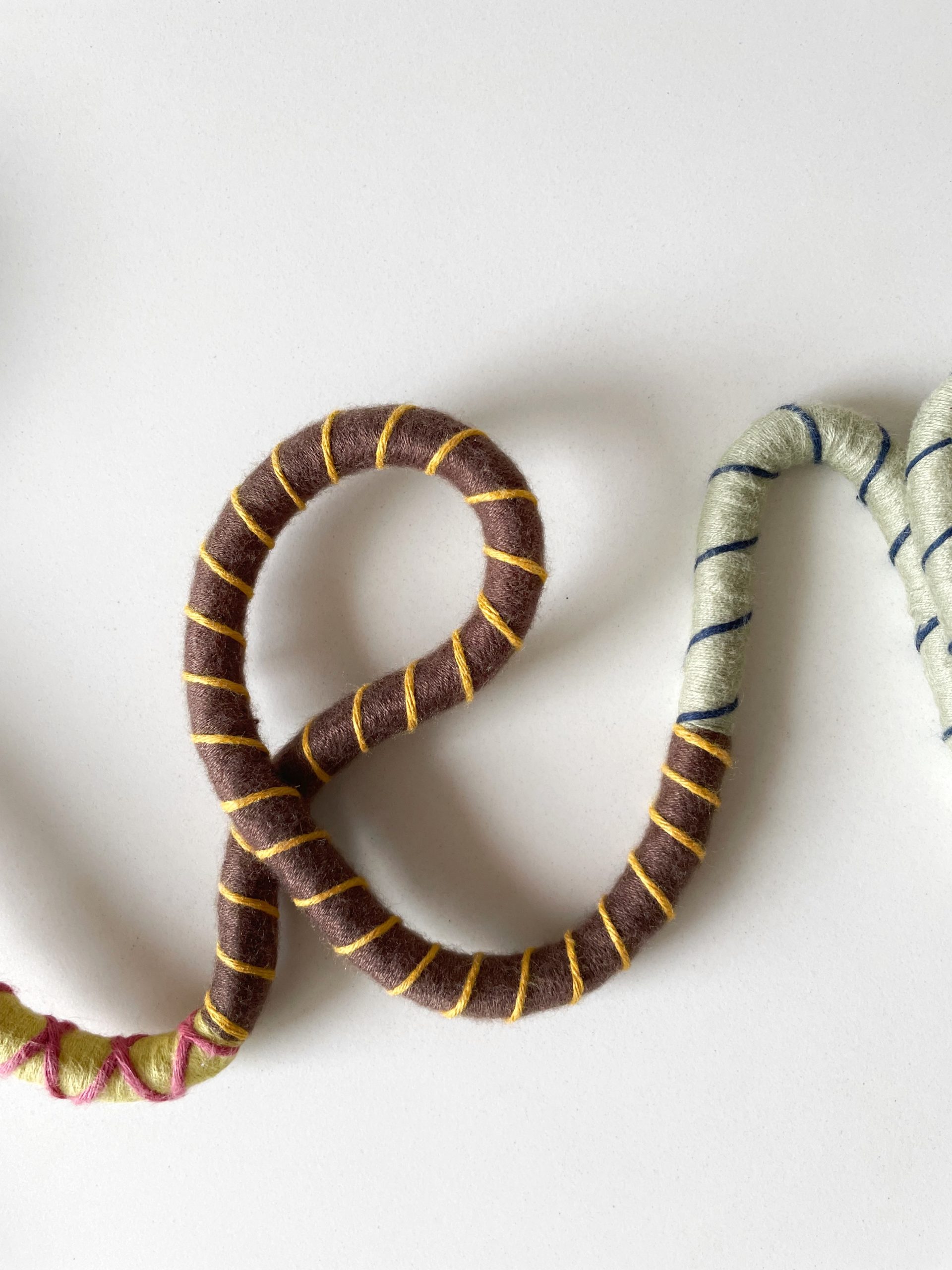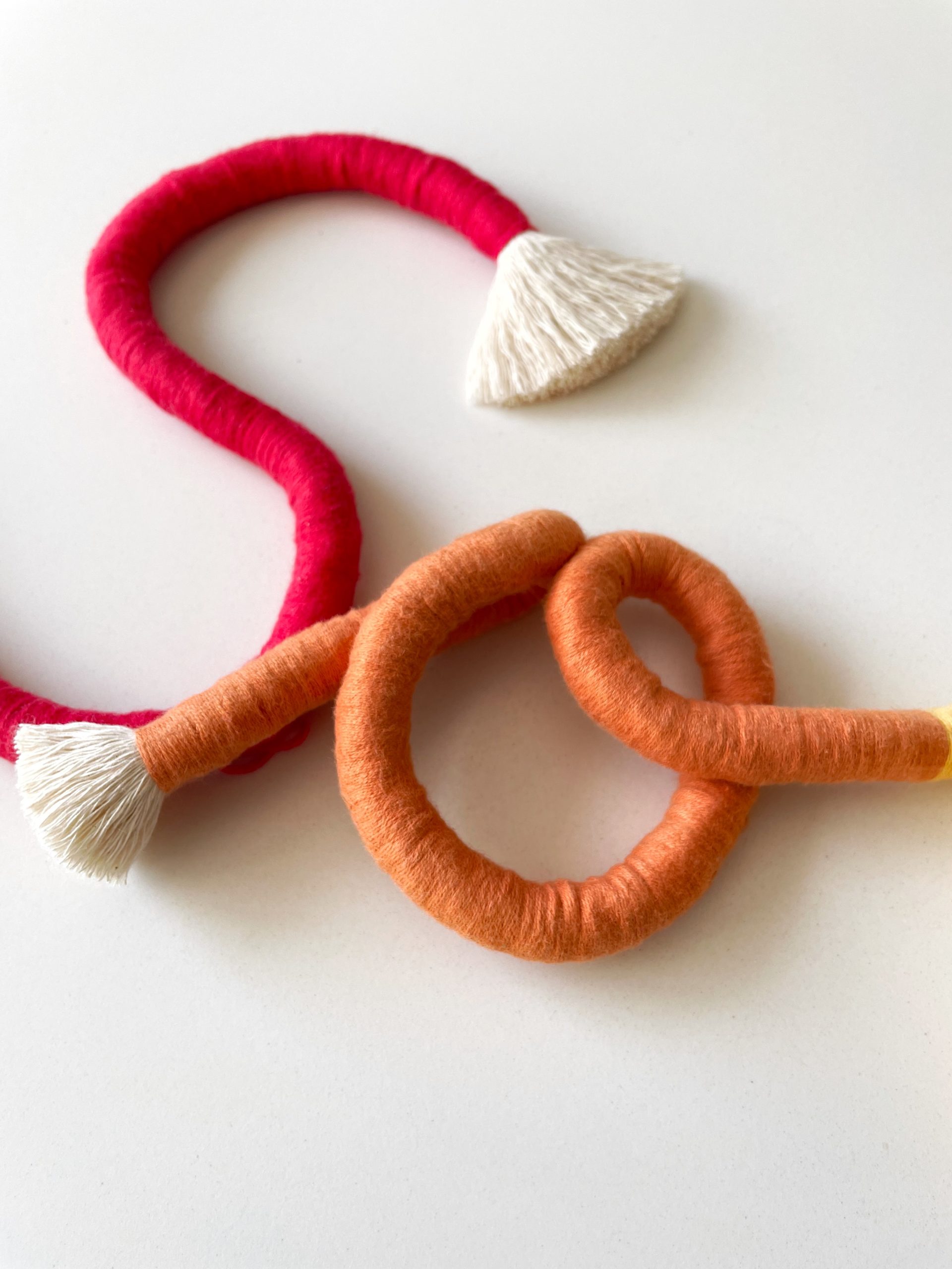 Hilo y cuerda de algodón 100% de 6 mm y 12 mm de grosor. Bolas decorativas de madera. Algunas piezas llevan una anilla de metal para una buena sujeción a la pared. Interior de las letras con alambre para dar la forma y que tengan mayor resistencia.