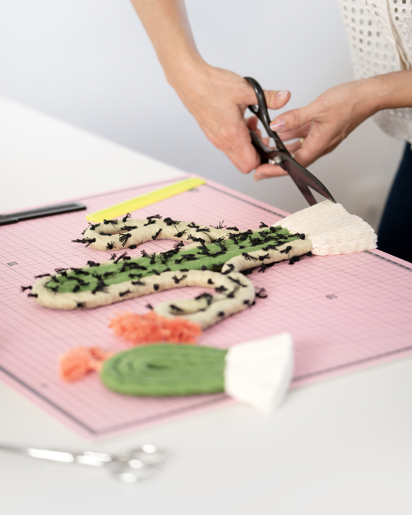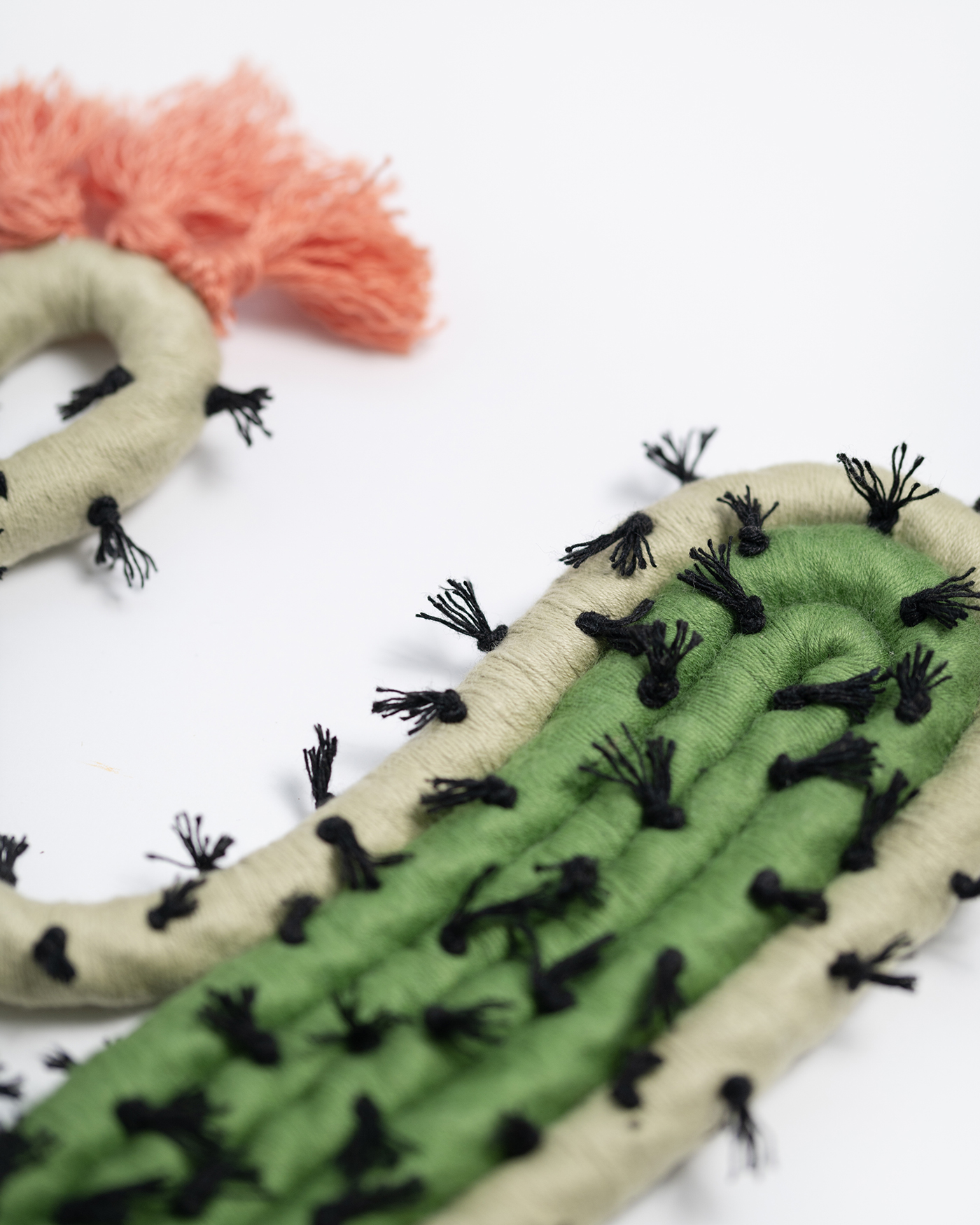 Set de 2 cactus de diferentes tamaños y formas. Figura decorativa con anilla en la parte posterior para colgar en pared, con los colores característicos, flores y pinchos hechos con hilo. Cuerda de 12 mm y acabado con flecos.